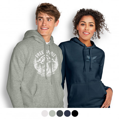 Versatile 280gsm fleece-lined adult sweatshirt which is manufactured from a 50/50 blend of ring-spun cotton and polyester with ribbed elastane on the hem and cuffs. It has set in sleeves, a large kangaroo pocket on the front and a tone-on-tone drawstring in the hood. The brushed fleece lining gives the garment a soft and cosy feel while adding extra warmth. It is a European fit and is available in eight sizes. The sweatshirt provides an excellent branding opportunity that will appeal to a broad market.